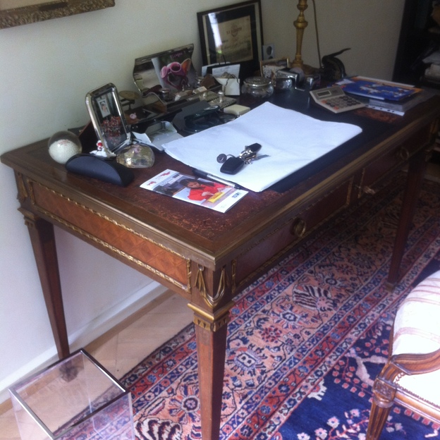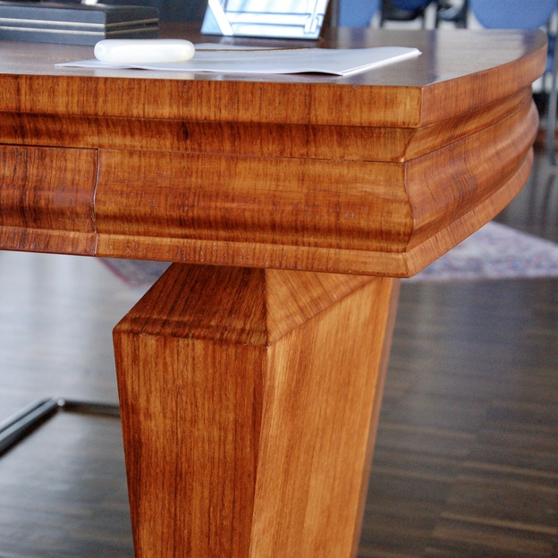 Die Schreibfläche aus echtem Leder mit umlaufendem Zierfries wurde nach exaktem Aufmaß gesondert hergestellt, fachgerecht eingearbeitet und eingeleimt.
