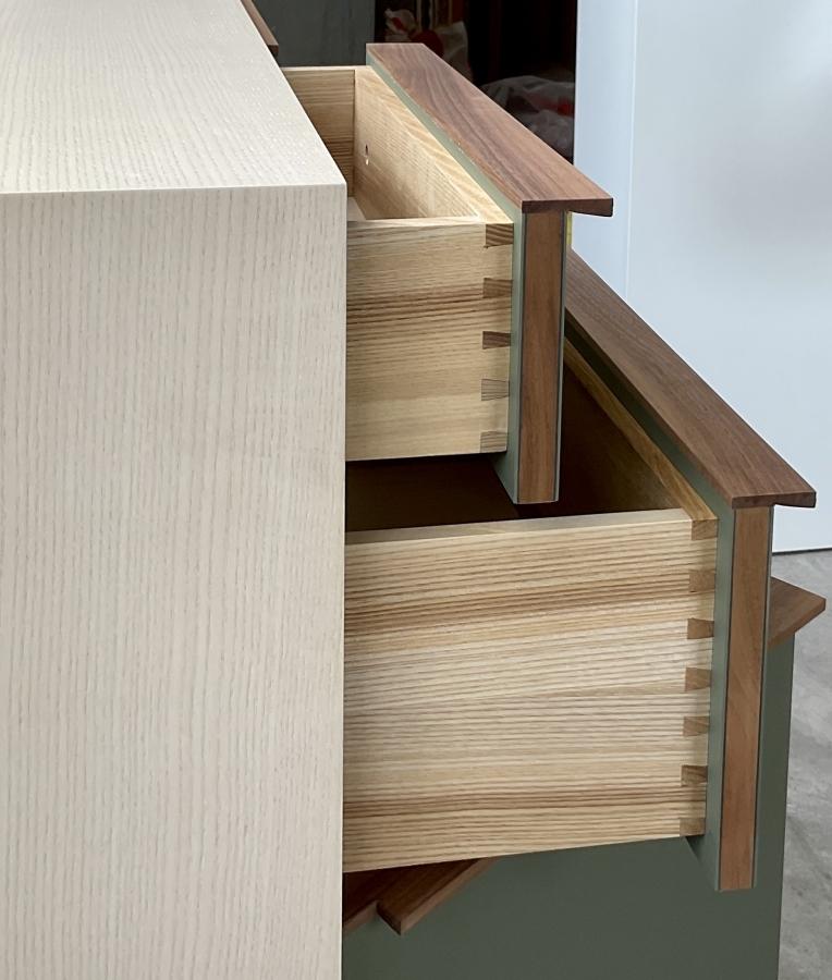 "Die Summe aller Teile: Linie, Proportionen und Gestell der Kommode sind eine frische Neuauflage eines alten Themas. Die zurückgenommene Farbe des Linoleums und die rhythmische Anordnung der Schubladen erzeugen einen harmonischen Eindruck."