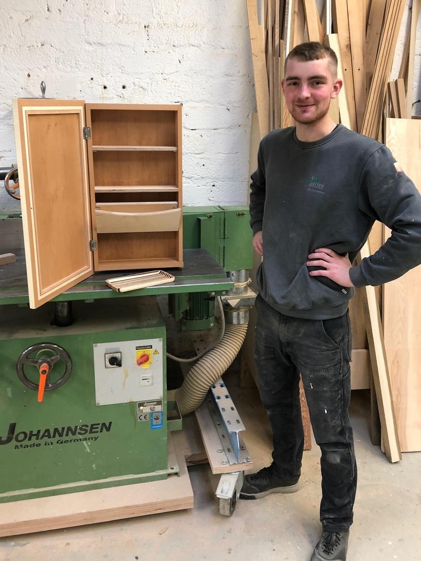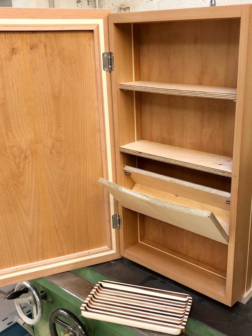der Schrank wurde im Rahmen einer Projektarbeit in einem festgelegten, engen Zeitrahmen realisiert. Trotzdem entstand ein tolles Möbel, das fachgerecht hergestellt und mit vielen ausgefeilten Details und großer Präzision hergestellt wurde.