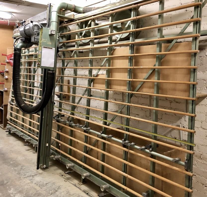 Die Arbeit an der Plattensäge ist in der Regel der Beginn eines jeden Möbelstücks. Hier werden die benötigten und aus dem Plattenlager geholten Korpusteile erst einmal besäumt und grob zugeschnitten.