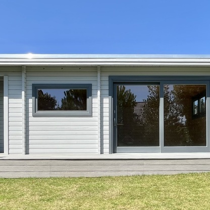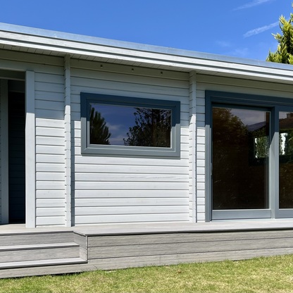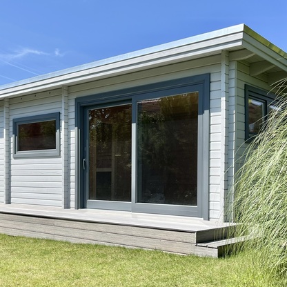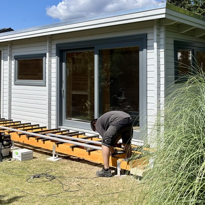 Terrasse aus WPC vor vorhandener Sauna-Hütte
