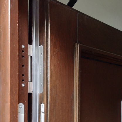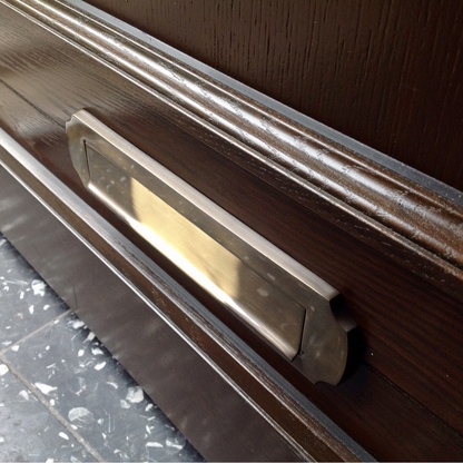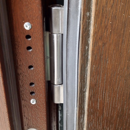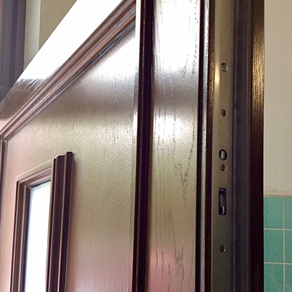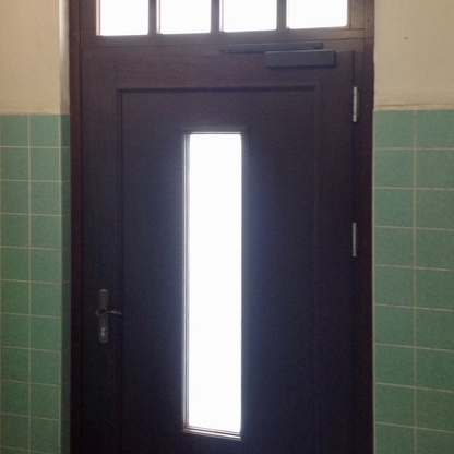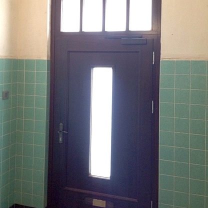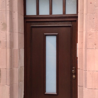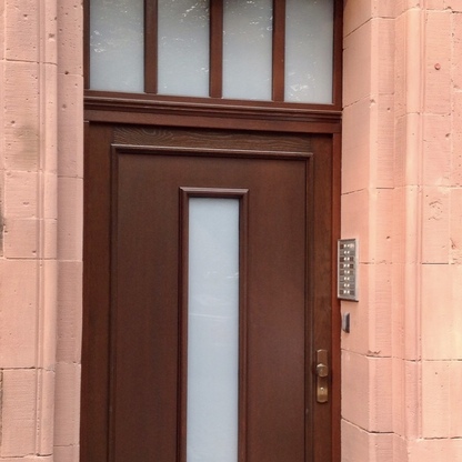 Haustürelement aus massivem Merantiholz, Oberfläche in Mahagoni endbehandelt