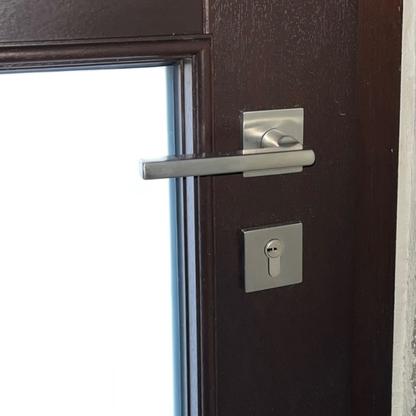 • Schutzbeschlag mit eckigen Rosetten und Zylinderabdeckung in Edelstahl