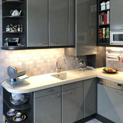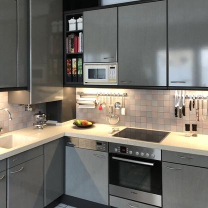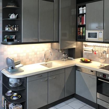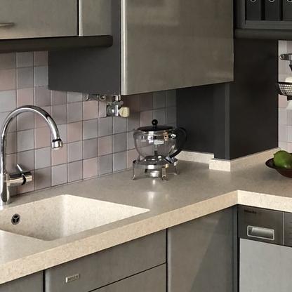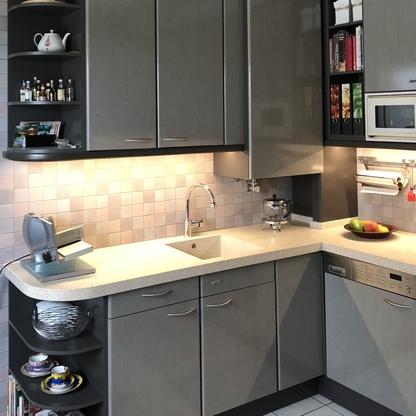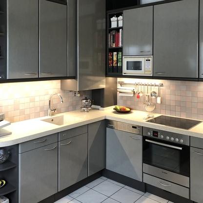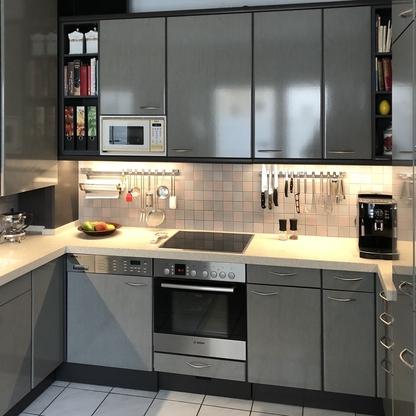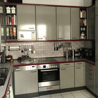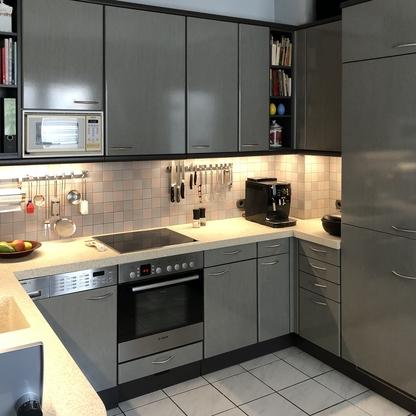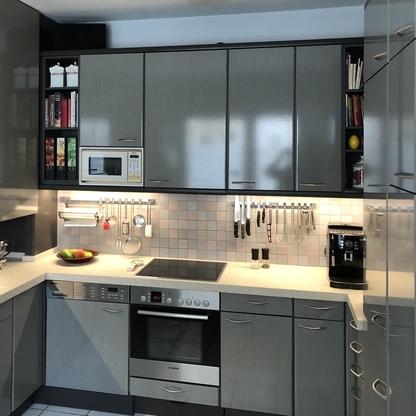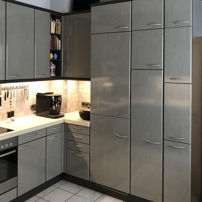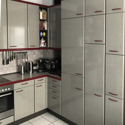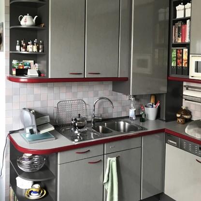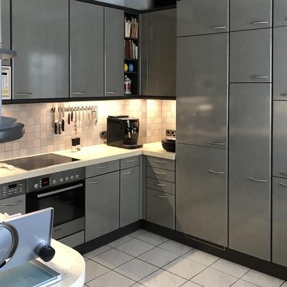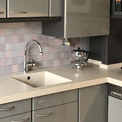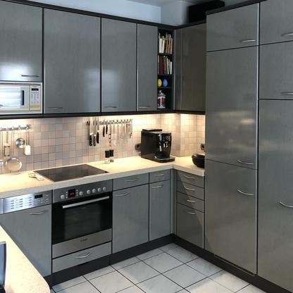 Küchenfronten überarbeitet, Kranz- und Profilleisten neu lackiert, Segmentgriffe erneuert, Küchenarbeitsplatte in CORIAN inkl. Spülbecken neu hergestellt und eingearbeitet