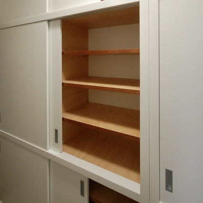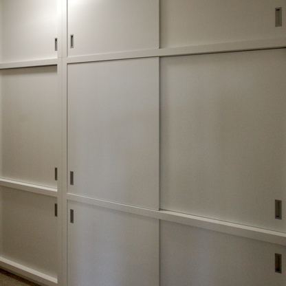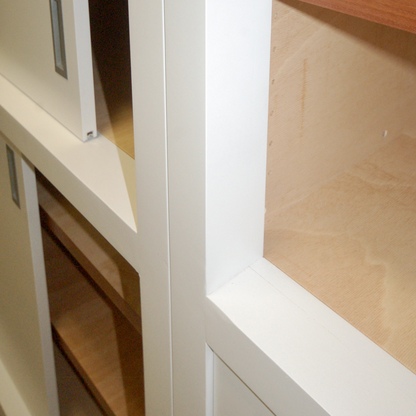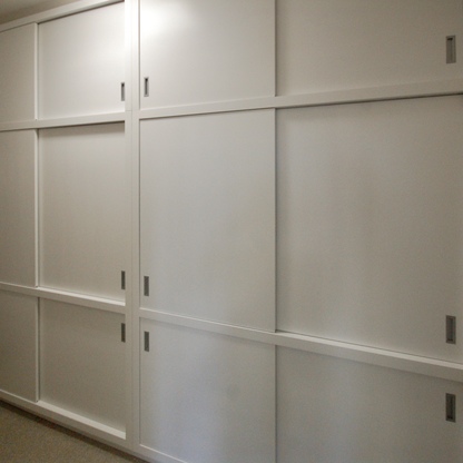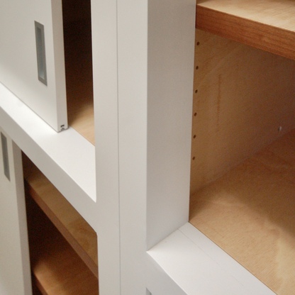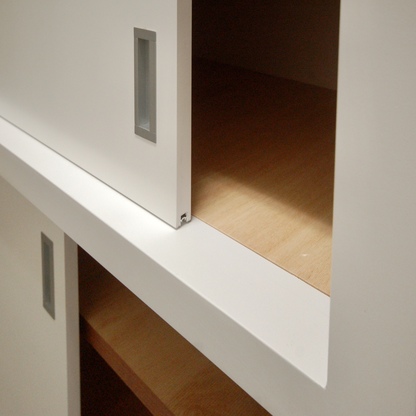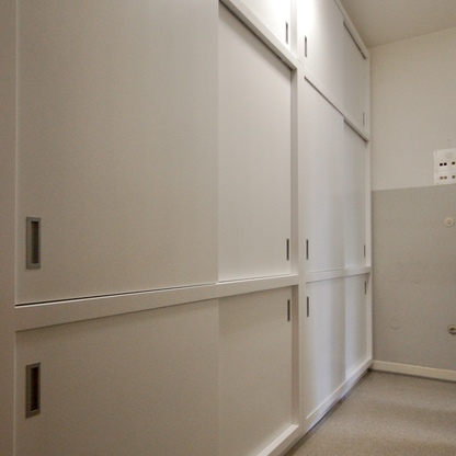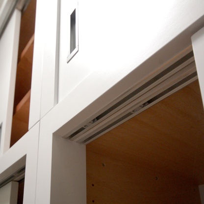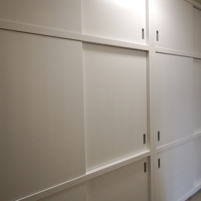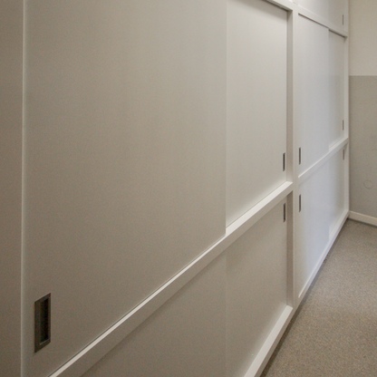 • Schiebetüren aus Tischlerplatten, deckend weiß lackiert